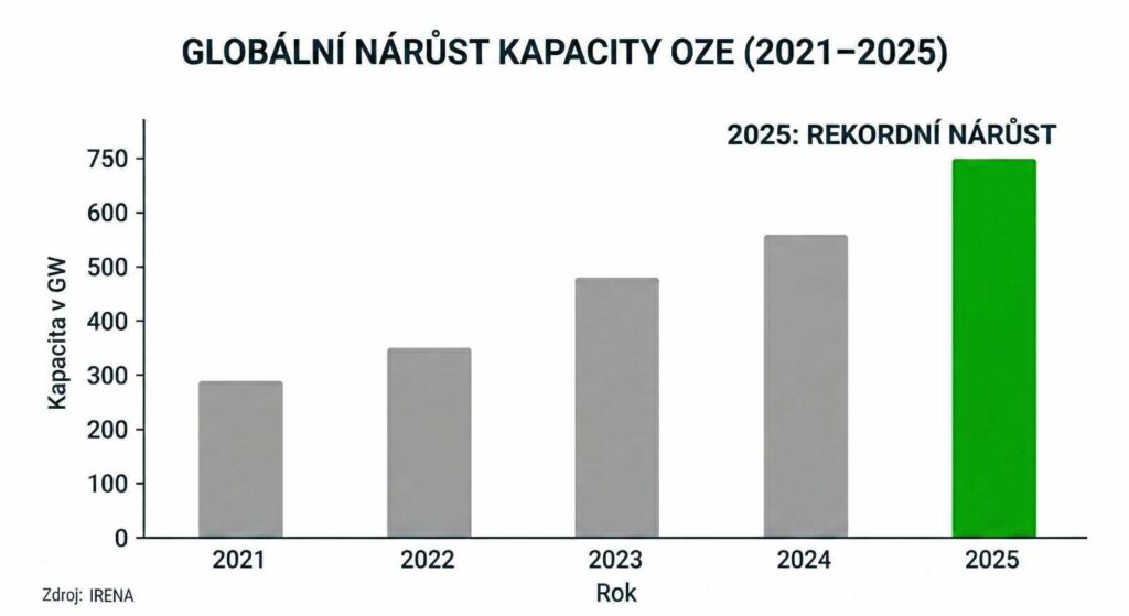 Podle zprávy IRENA dosáhl světový nárůst kapacity obnovitelných zdrojů energie (OZE) v roce 2025 rekordních 694 GW. To představuje meziroční nárůst o 14 % a potvrzuje, že čistá energetika je i přes ekonomické výkyvy nejrychleji rostoucím odvětvím světa.